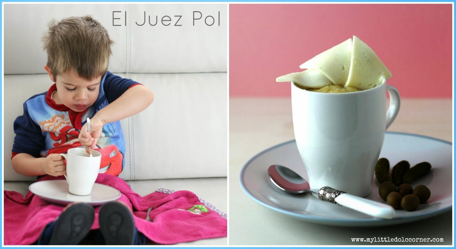 Cuando lo saquéis lo dejáis enfriar un poco (¡sale ardiendo!), lo decoráis a vuestro gusto y acompañáis de lo que más os apetezca. Como lo hice para Pol y le encantan los pepinillos y las olivas, lo acompañé con unos cuantos de cada y decoré con queso manchego que también le gusta mucho.