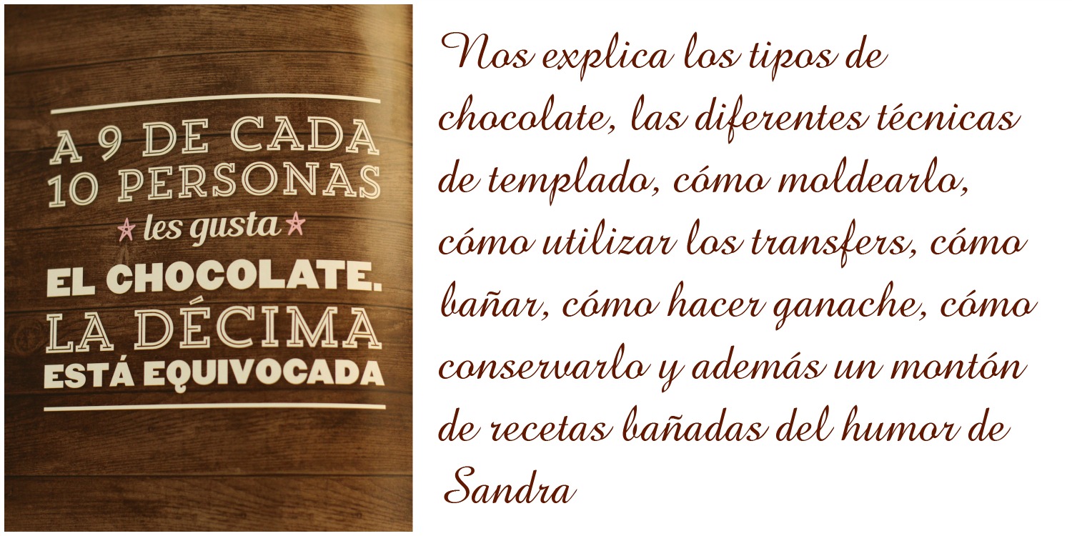 Sabido es por los que me conocéis que soy adicta al chocolate, mucho, mucho. Pues Sandra se ha propuesto torturarme con este libro. Está todo lo que te puedas imaginar sobre el chocolate. No falta nada y además, explicado de forma sencilla. Si todavía no habéis hecho la carta a Papá Noel o a los Reyes, no lo dudéis, no os arrepentiréis.