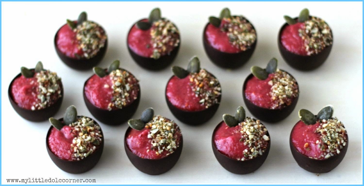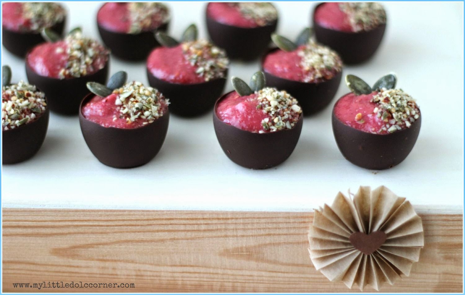 Con la mezcla de pipas y almendras saladas que nos ha sobrado de hacer la base decoramos las cápsulas y con unas cuantas pipas de calabaza enteras decoramos. Yo he hecho la decoración que parecen manzanitas rojas, ¿no os parece?.