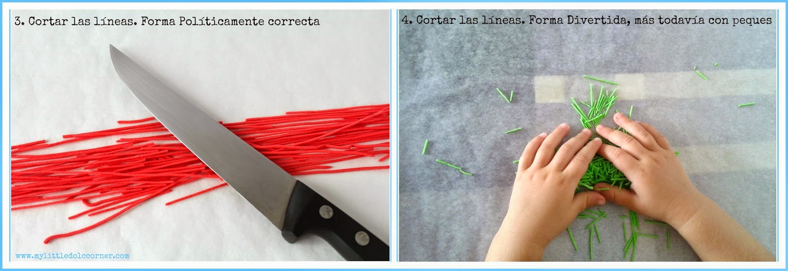 Entonces juntamos las líneas y la manera políticamente correcta es que con un cuchillo vayamos cortando las líneas y convirtiéndolas en fideos. Pero la divertida (y más si tenéis niños) es hacerlo con las manos. Destrozar las líneas y hacerlas añicos (con las manos bien limpias, eh!).