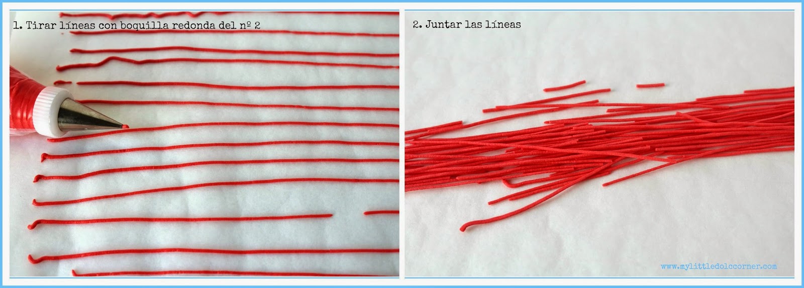Cuando tengamos la glasa lista, debemos coger una boquilla redonda del número 2 y una manga pastelera y a delinear. Hacer líneas y líneas como posesos. Dejar secar mínimo 1 hora, aunque lo ideal es dejarlas secar toda la noche así estarán totalmente secas sin resto de humedad por ningún sitio.